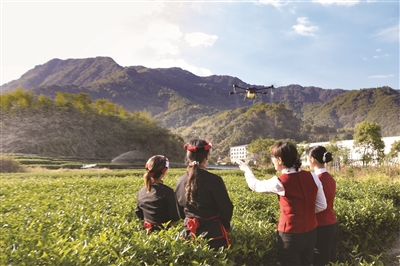 福建是我国重要茶产区,中信银行在福建创新推出普惠“茶山贷”,助力福建中小茶企树品牌、稳增产,积极支持乡村振兴。图为中信银行福州分行客户经理协同中信农业基金工作人员在茶山察看数字农服解决方案的落地情况。