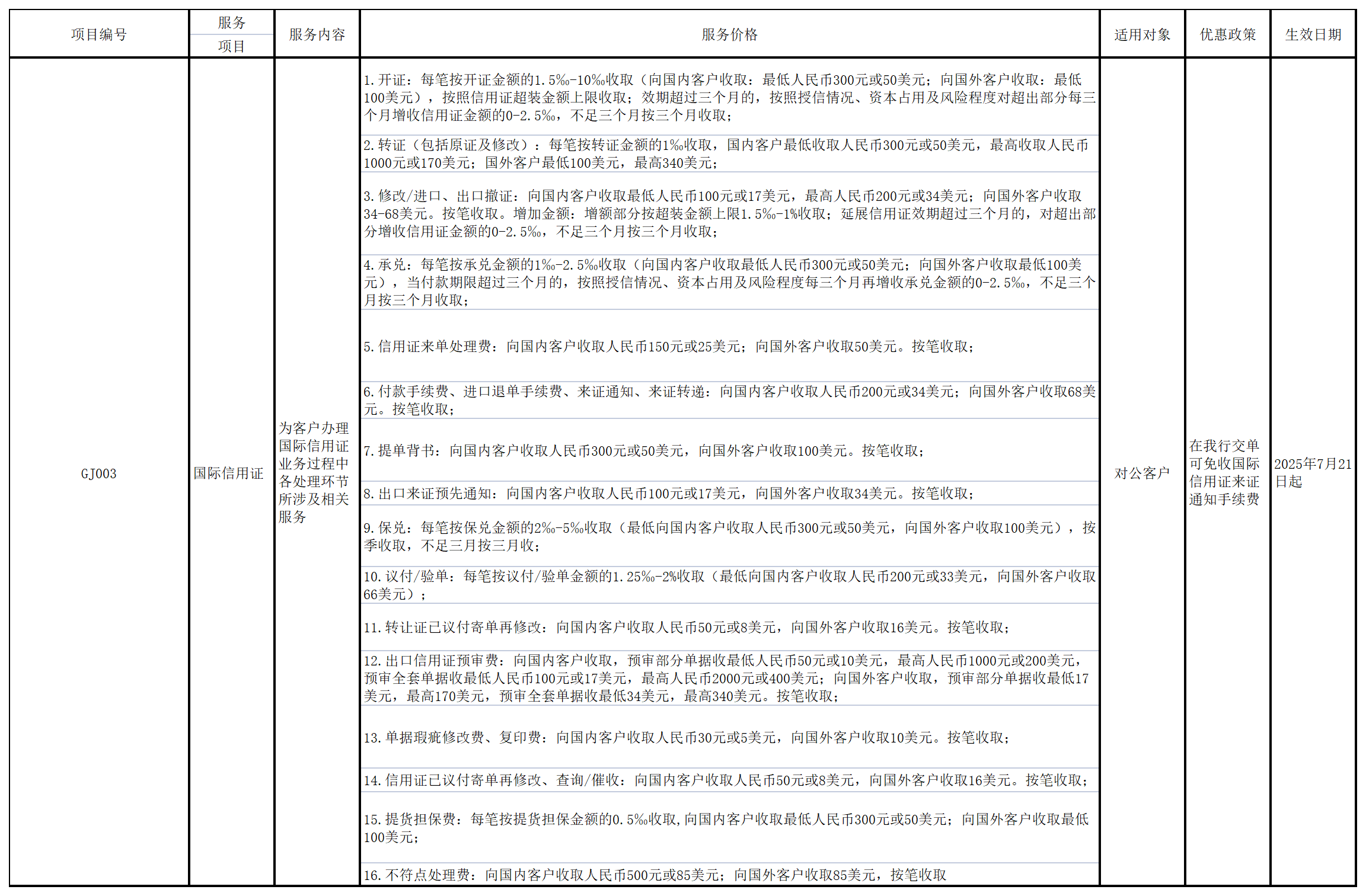 根据业务发展需要,我行拟调整部分服务收费项目,根据《商业银行服务价格管理办法》(中国银监会 国家发展改革委令2014年第1号)的规定,现将调整后的服务项目及服务价格予以公示如下: