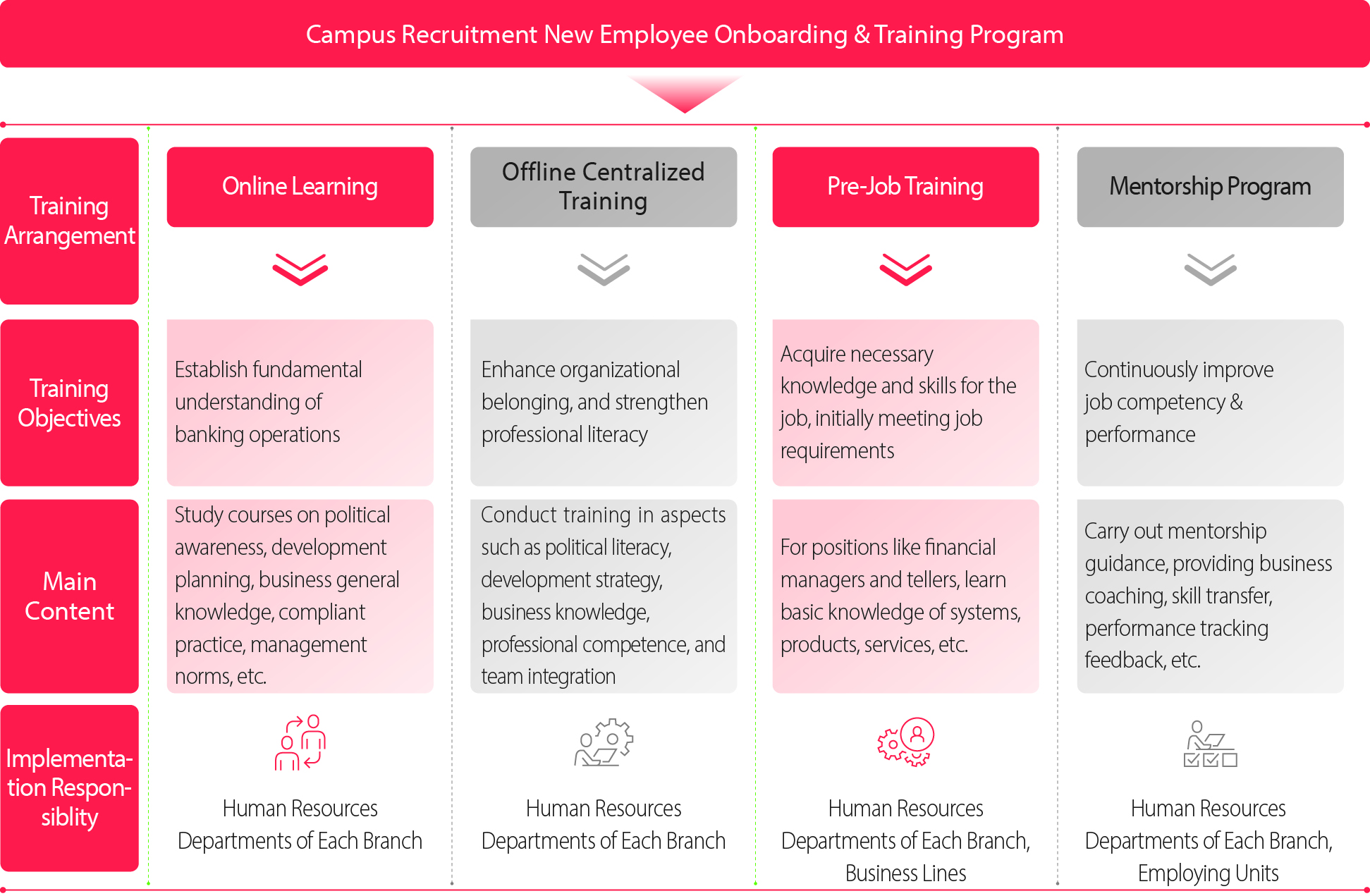 The Bank actively conducts training programs for campus recruits and social hires, comprehensively covering corporate strategy, business fundamentals, compliance practices, and institutional norms to help new employees integrate swiftly into the corporate culture and their roles.