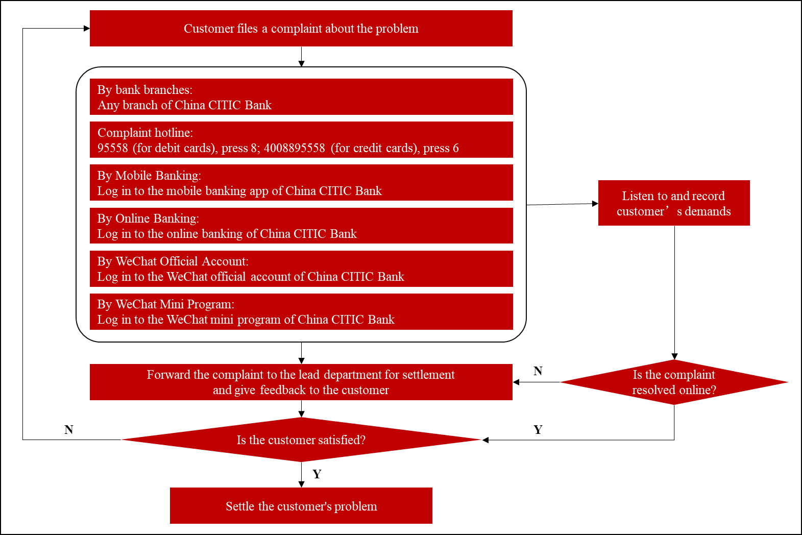 The Wealth Management Department and Credit Card Center of China CITIC Bank have established Customer Service Centers respectively, responsible for handling complaints related to debit card and credit card services. Dedicated complaint resolution specialists within these centers oversee the entire process, ensuring timely and effective resolution, and conducting follow-up with consumers to confirm satisfaction. The internal inspection mechanism is set up for the handling of customer complaint cases. In such a mechanism, the entire process is monitored from such five aspects as service etiquette, standard service expressions, the purpose of the call, accuracy and proficiency in answering questions, and risk awareness operation. Various monitoring indicators are assigned scores, and the handling of customer complaints is scored based on the quality of responses, which is considered in the performance evaluations. The Consumer Rights Protection Office of our bank collects and compiles complaint-handling data from the Wealth Management Department and the Credit Card Center, regularly reporting the bank's overall complaint-handling status to the Board of Directors, the Board of Supervisors, and their subordinate Consumer Rights Protection Committee.