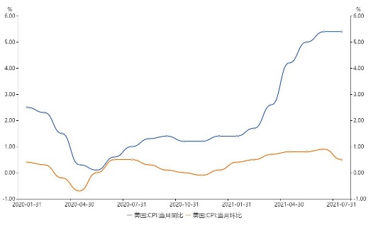 正当市场纷纷进行货币政策紧缩预期交易之时,事情就出现了转折。8月11日,美国7月CPI继续维持上涨势头,7月整体CPI同比增长5.4%,预期增长5.3%,前值5.4%。美国7月核心CPI同比涨4.3%,预期4.3%,前值4.5%,增速略微放缓。食品能源基数效应、租金成本和二手车价格增速放缓,是7月CPI涨势放缓以及核心CPI高位震荡的主要因素。